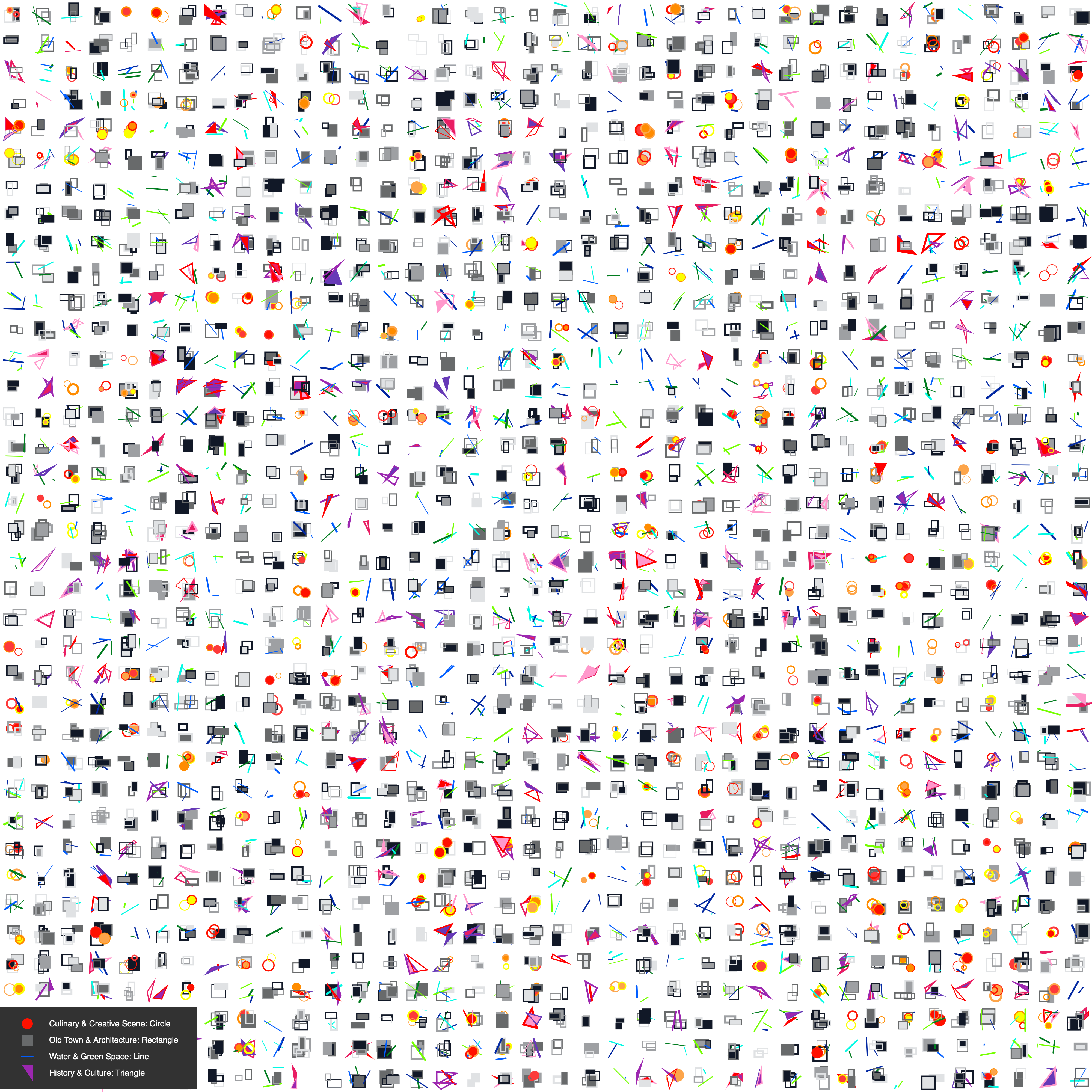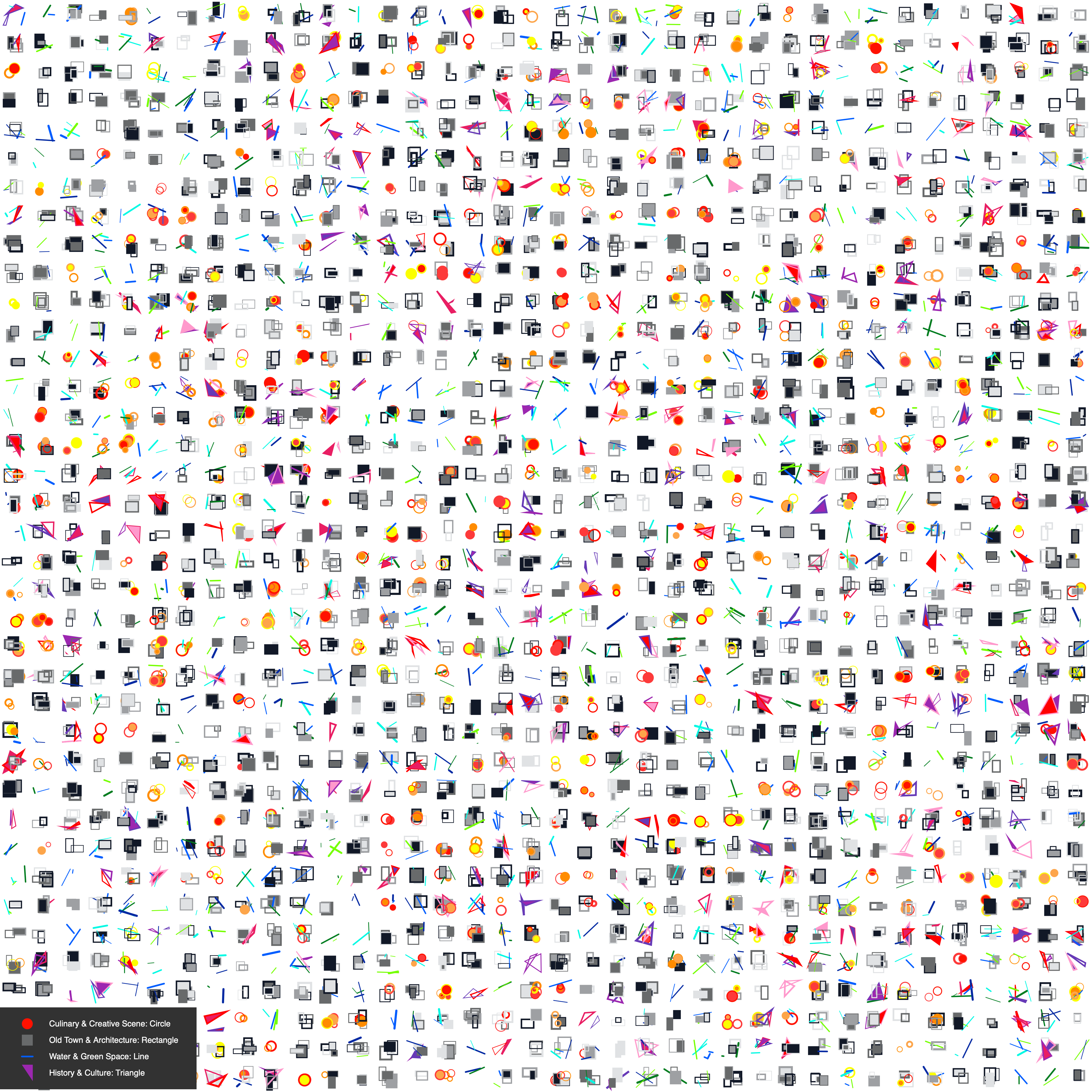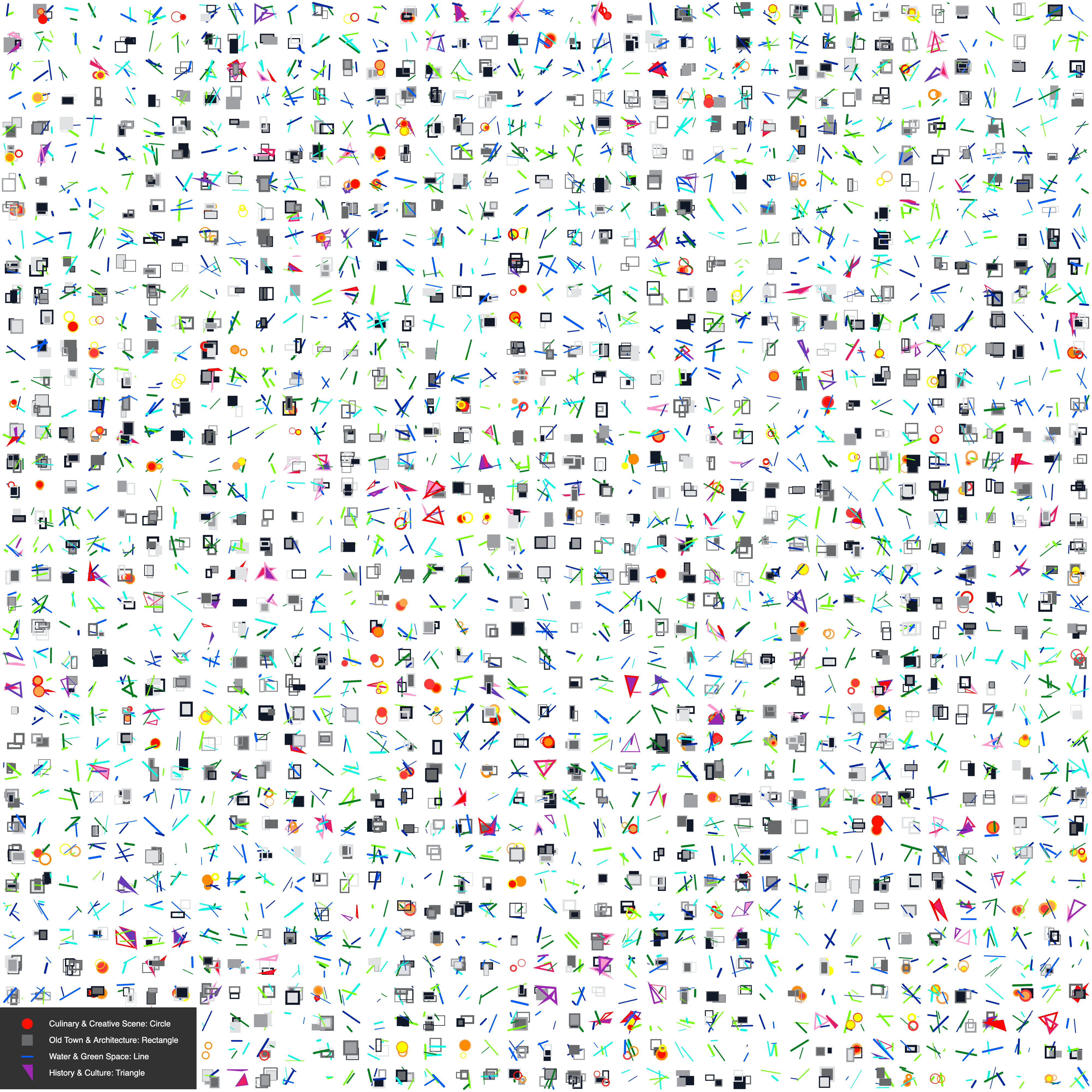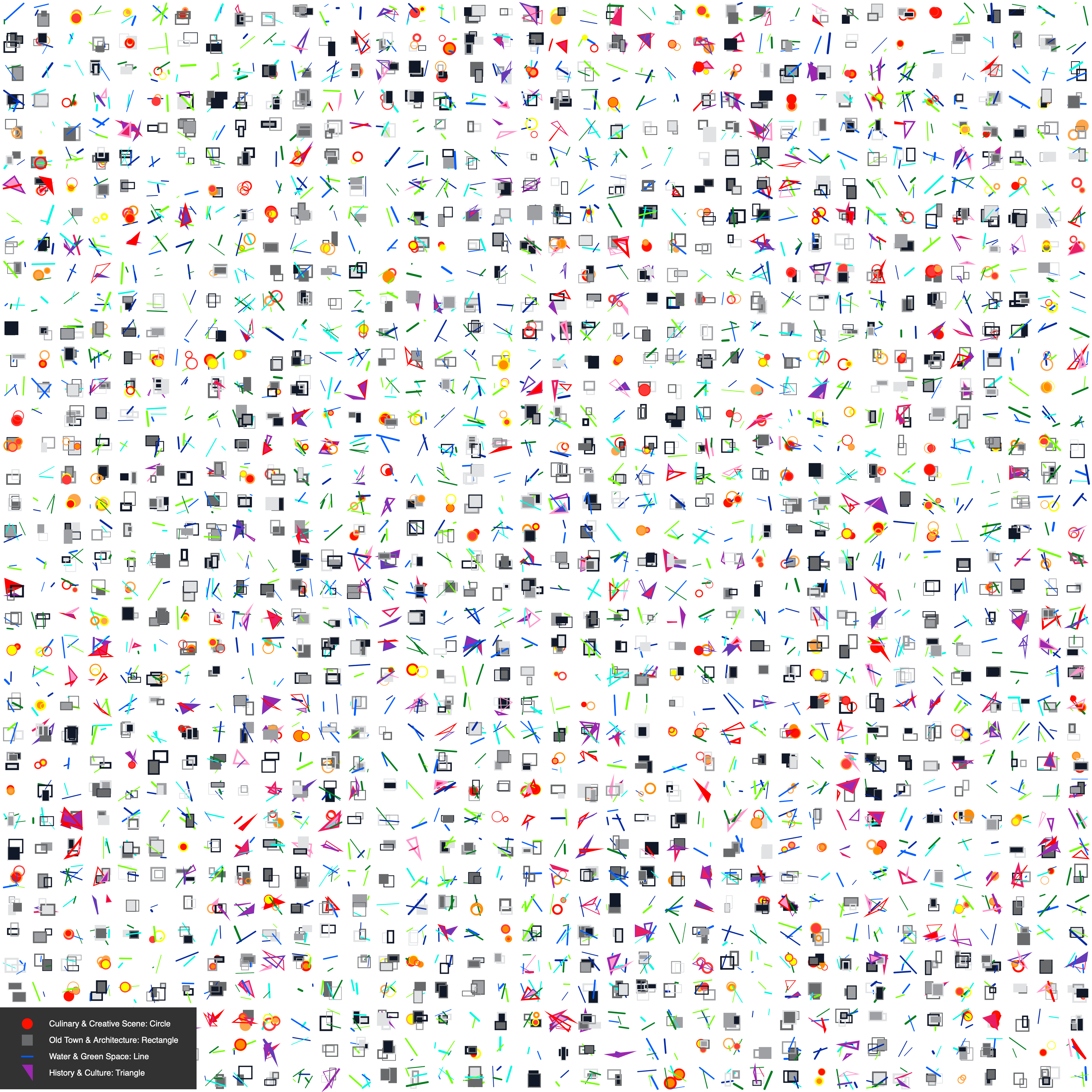 Ausgangspunkt ist die Sammlung charakteristischer Merkmale einer Stadt – etwa ihre Größe, Bevölkerungszahl, Dichte, Wahrzeichen oder besonderer Eigenheiten. Zu individuellen Symbolen vereinfacht werden diese einer Stadt zugeordnet und anschließend in einer zusammenhängenden Komposition vereint. So entstehen vielschichtige Landschaftsbilder, in denen jedes Symbol als Teil eines landschaftlichen Mosaiks sichtbar wird.
