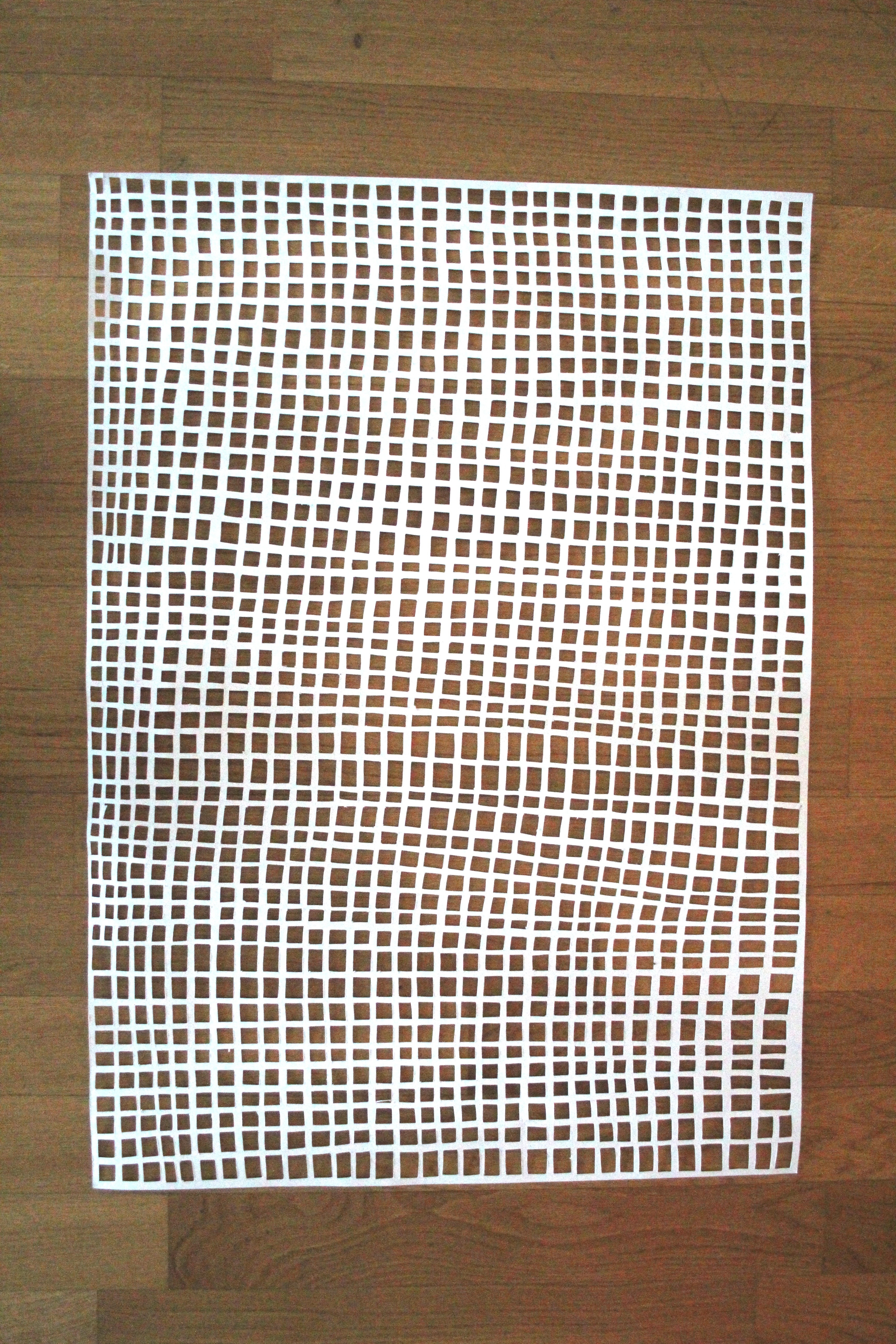 Durch präzise manuelle Eingriffe wie Anzeichnen, Schneiden und Entkernen modifiziere ich bestehende Rasterstrukturen. Auf der Grundlage eines einfachen, repetitiven Regelwerks entsteht ein filigranes Papiergitter, eine Schnittzeichnung und ein dreidimensionales Gefüge. Der manuelle Prozess erzeugt feine Ungleichmäßigkeiten innerhalb der strengen Ordnung, die bei genauer Betrachtung Brüche, Leerstellen und Momente von Fragilität sichtbar machen.