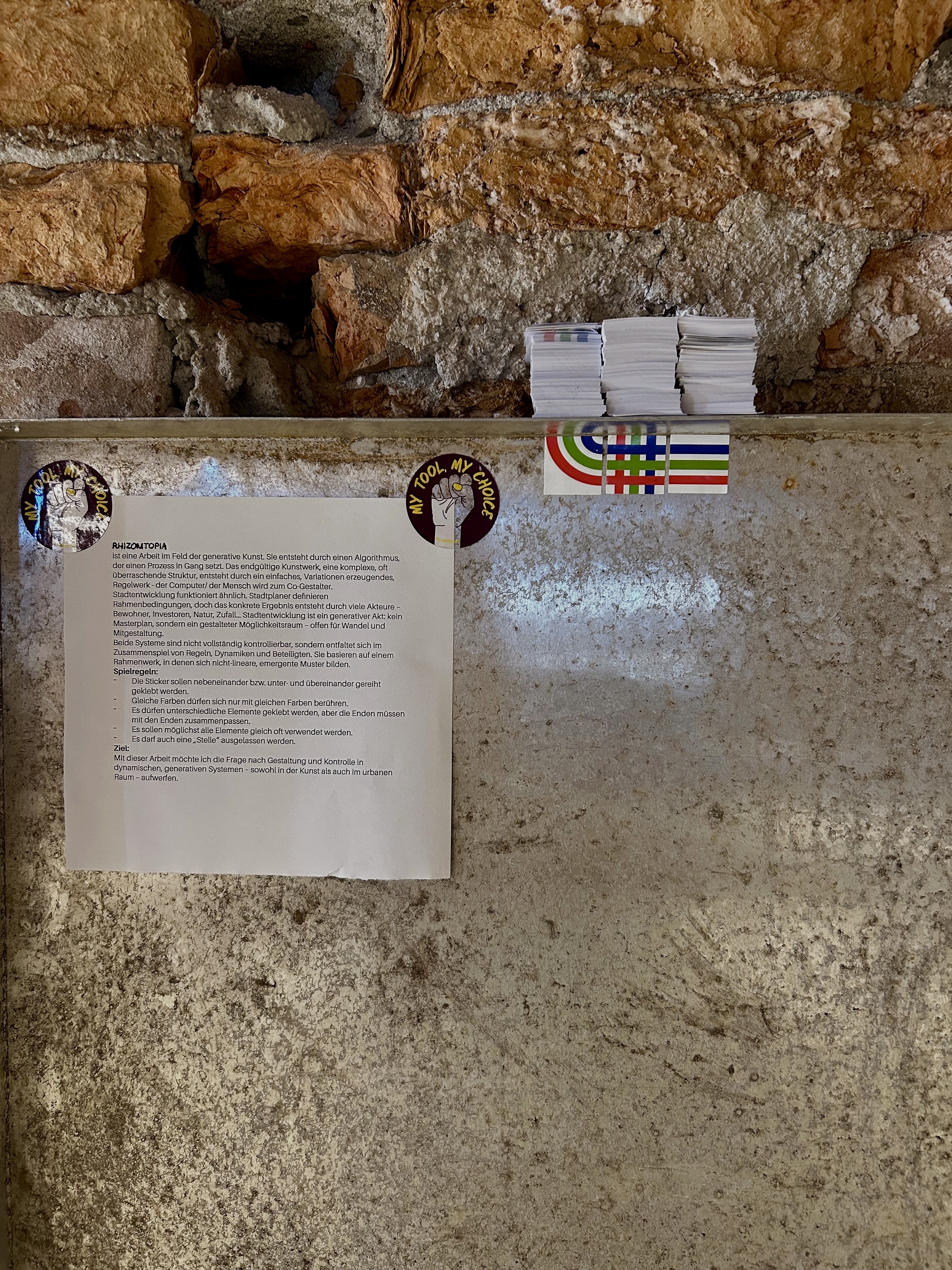 Vor diesem Hintergrund wollte ich eine Installation schaffen, die an ein Netzwerk erinnert. Es ist ein Spiel für die Besucher*innen, bei dem Sticker eine Wandinstallation formen. Die Arbeit besteht aus 4 x 4 cm großen Stickern mit einem bedruckten, gemusterten Vordergrund. Das Design erschließt sich dem Betrachter nach einiger Zeit zu einem Gesamtkunstwerk.