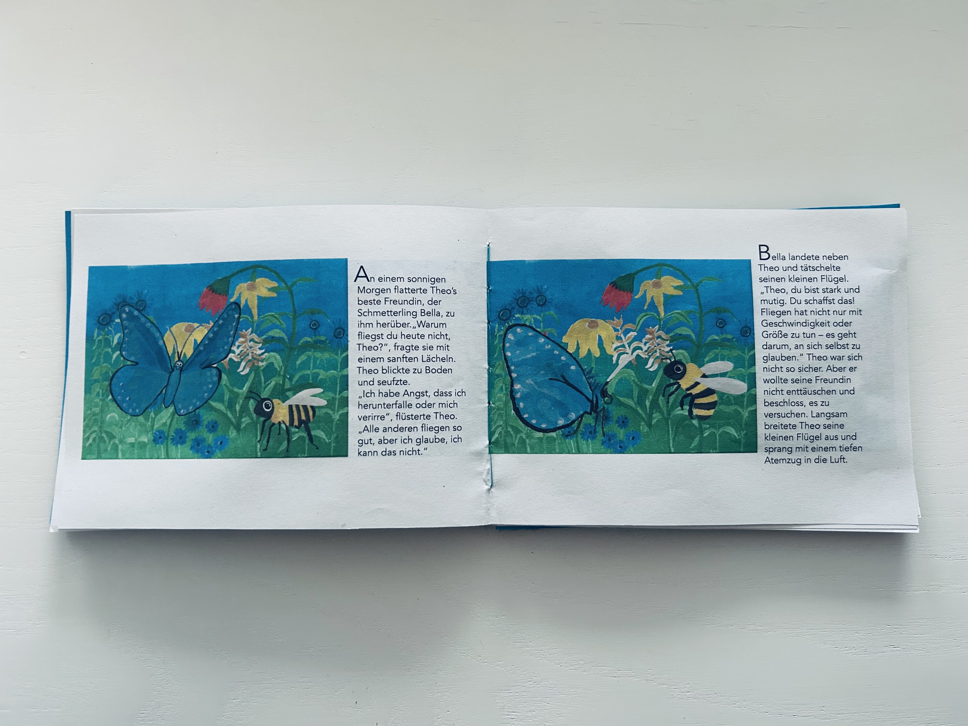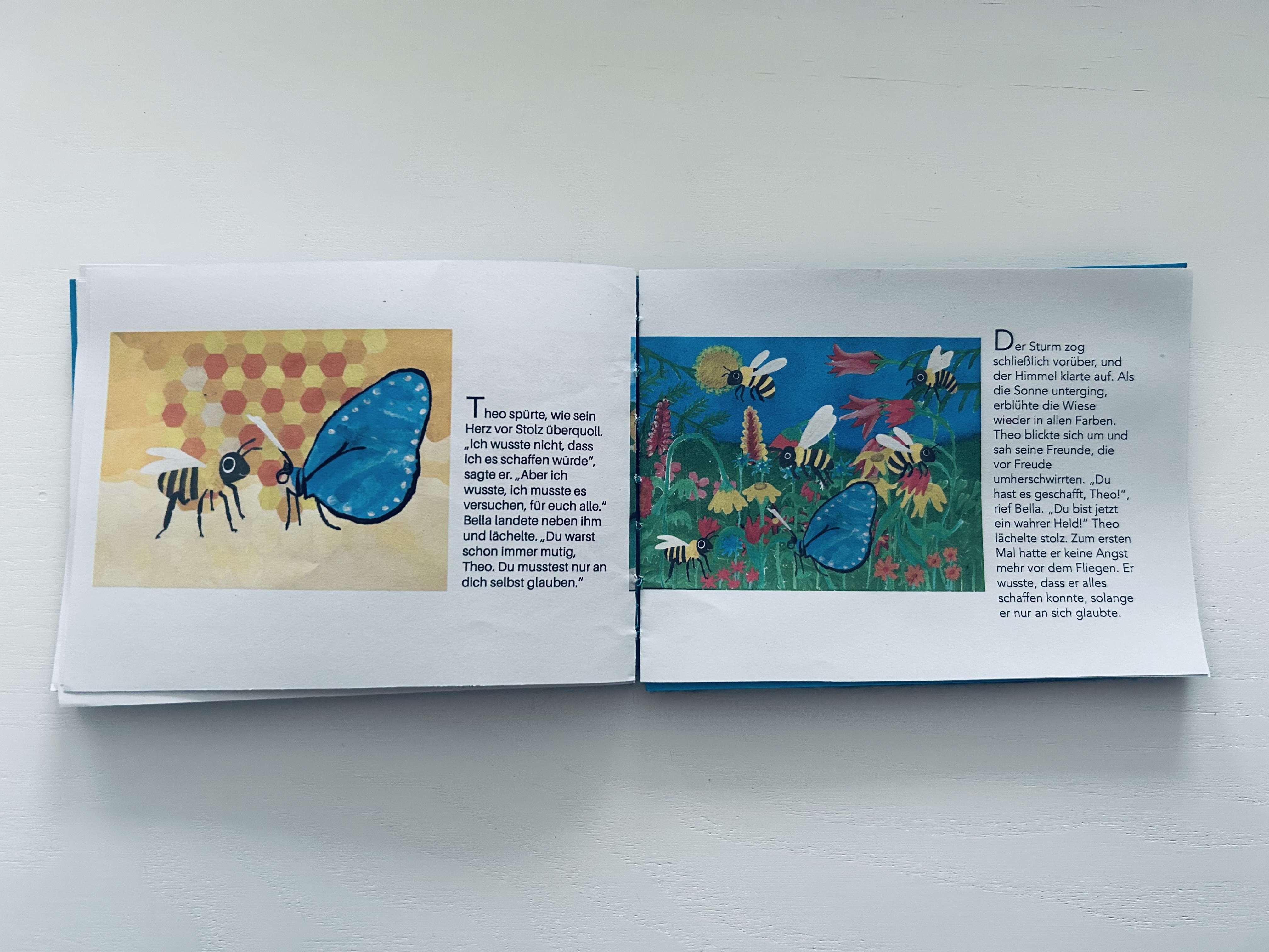Es war einmal, auf einer sonnigen Blumenwiese, da lebte eine kleine Biene namens Theo. Theo war kleiner als die anderen Bienen und hatte im Gegensatz zu ihnen Angst vor dem Fliegen. Er beobachtete seine Freunde, wie sie umherflitzten und Nektar sammelten, während er nervös auf einem Blatt saß und hoffte, sich verstecken zu können. Doch eines Tages fasst er Mut und besiegt seine Angst. Damit wird er zum Held der gesamten Blumenwiese.