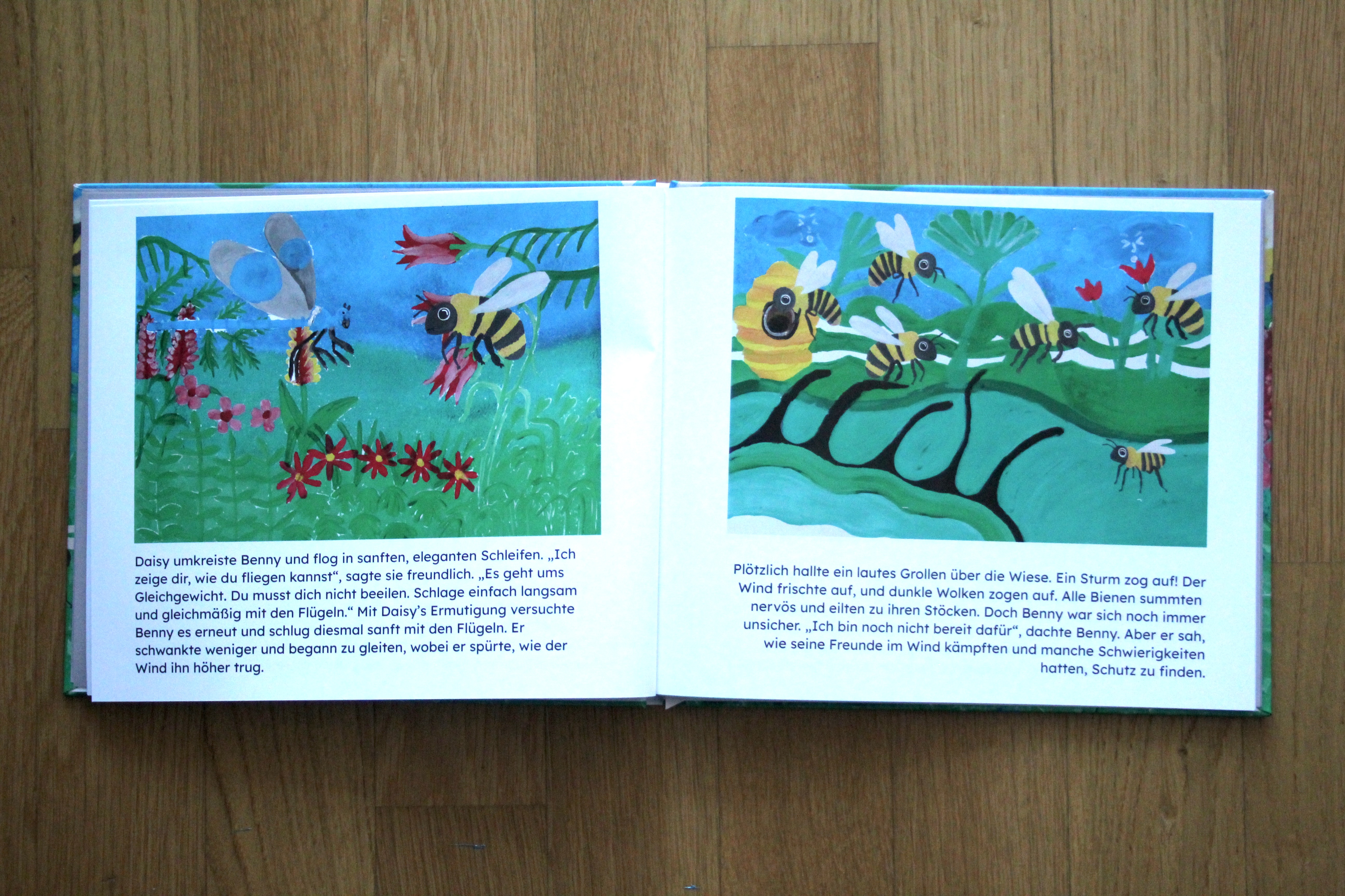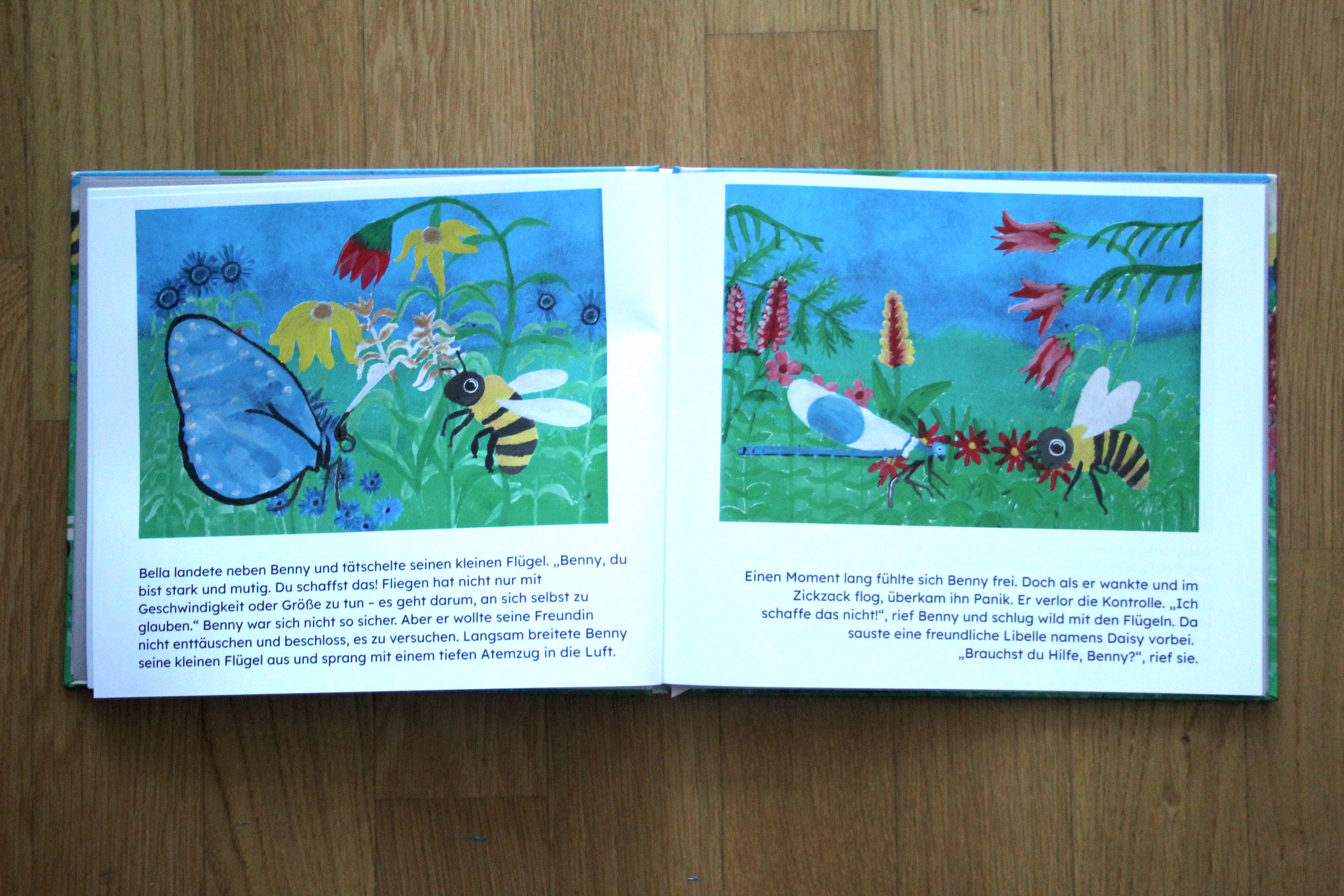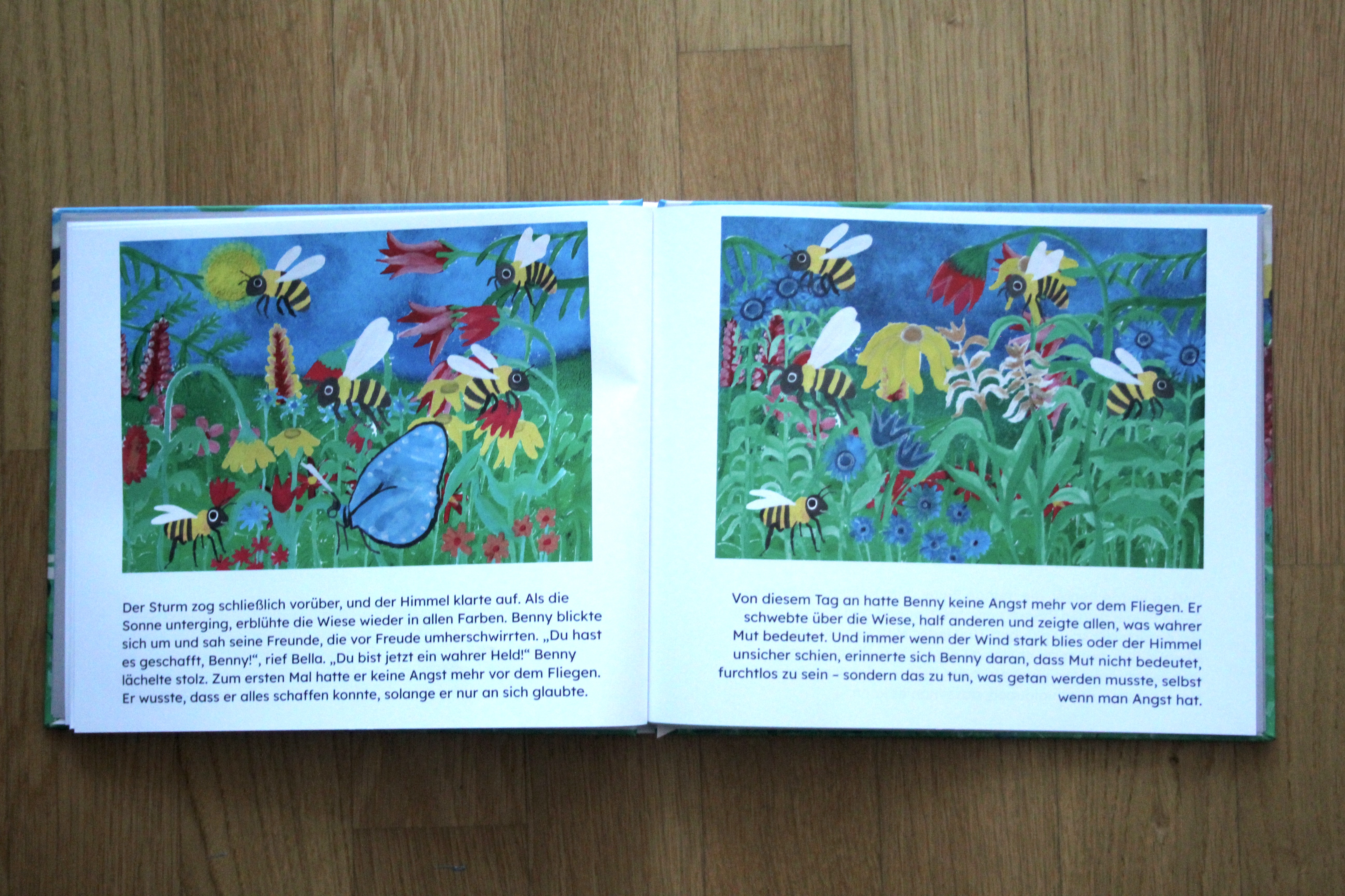 Es war einmal, auf einer sonnigen Blumenwiese, da lebte eine kleine Biene namens Benny. Benny war kleiner als die anderen Bienen und hatte im Gegensatz zu ihnen Angst vor dem Fliegen. Er beobachtete seine Freunde, wie sie umherflitzten und Nektar sammelten, während er nervös auf einem Blatt saß und hoffte, sich verstecken zu können. Doch eines Tages fasst er Mut und besiegt seine Angst. Damit wird er zum Held der gesamten Blumenwiese.