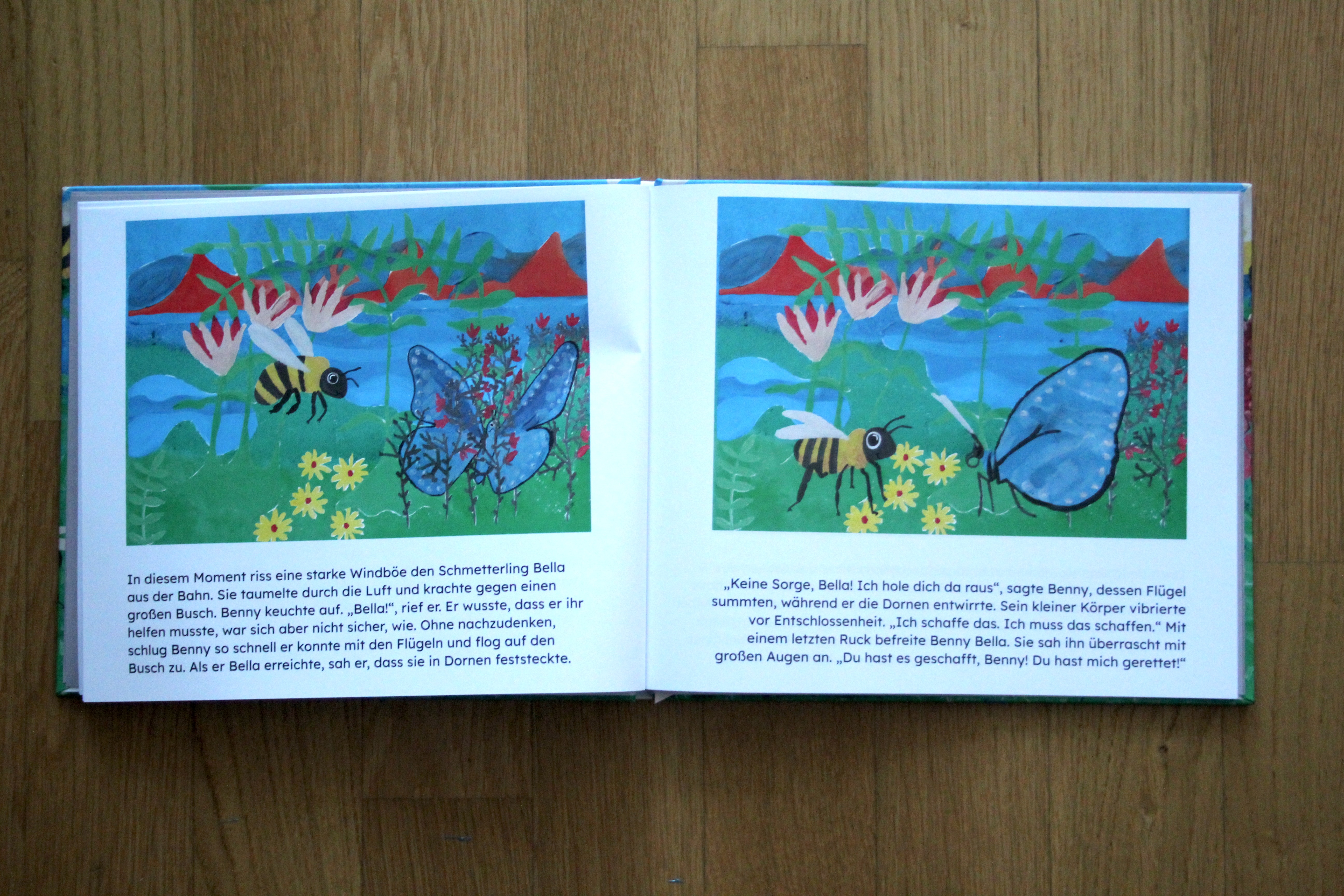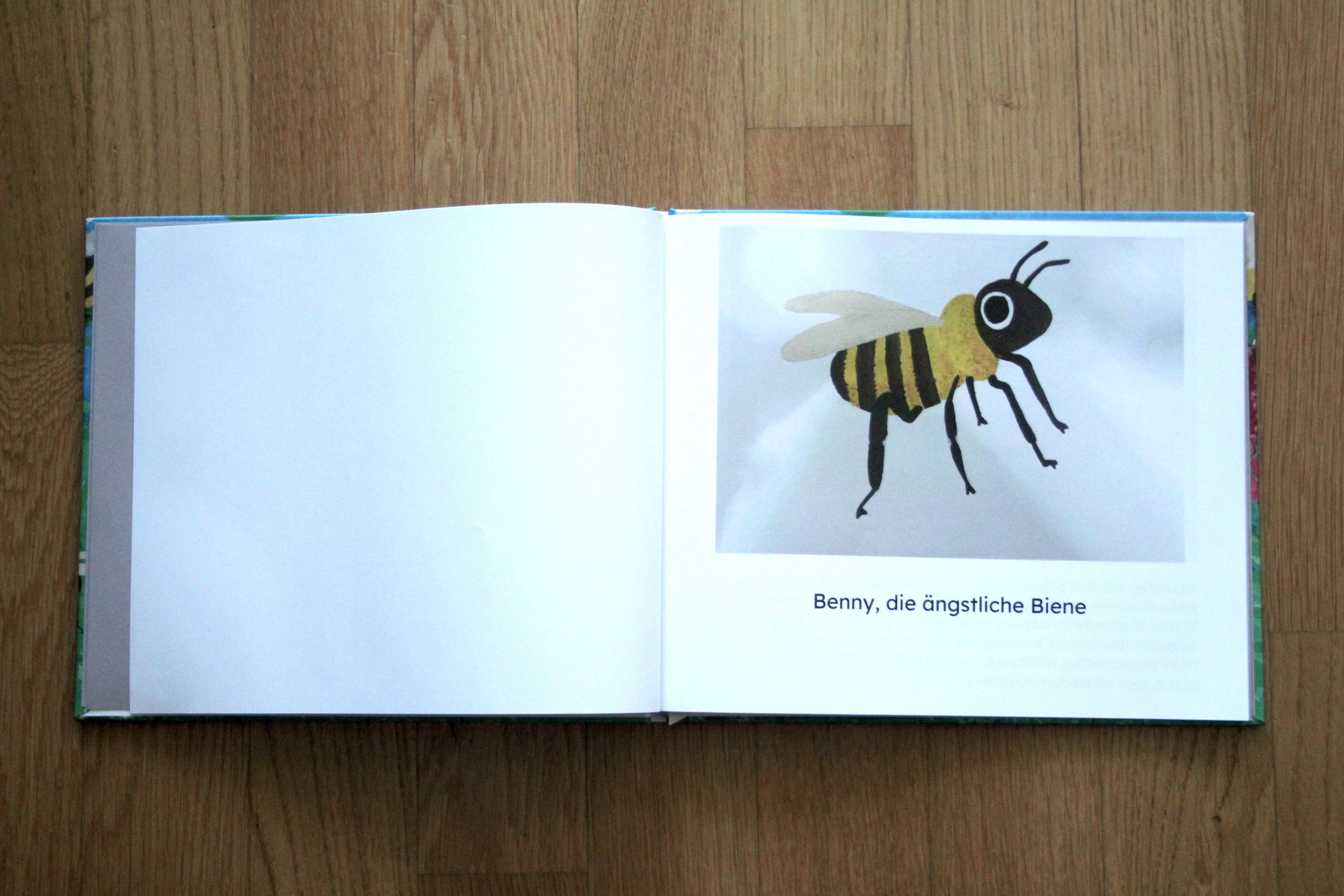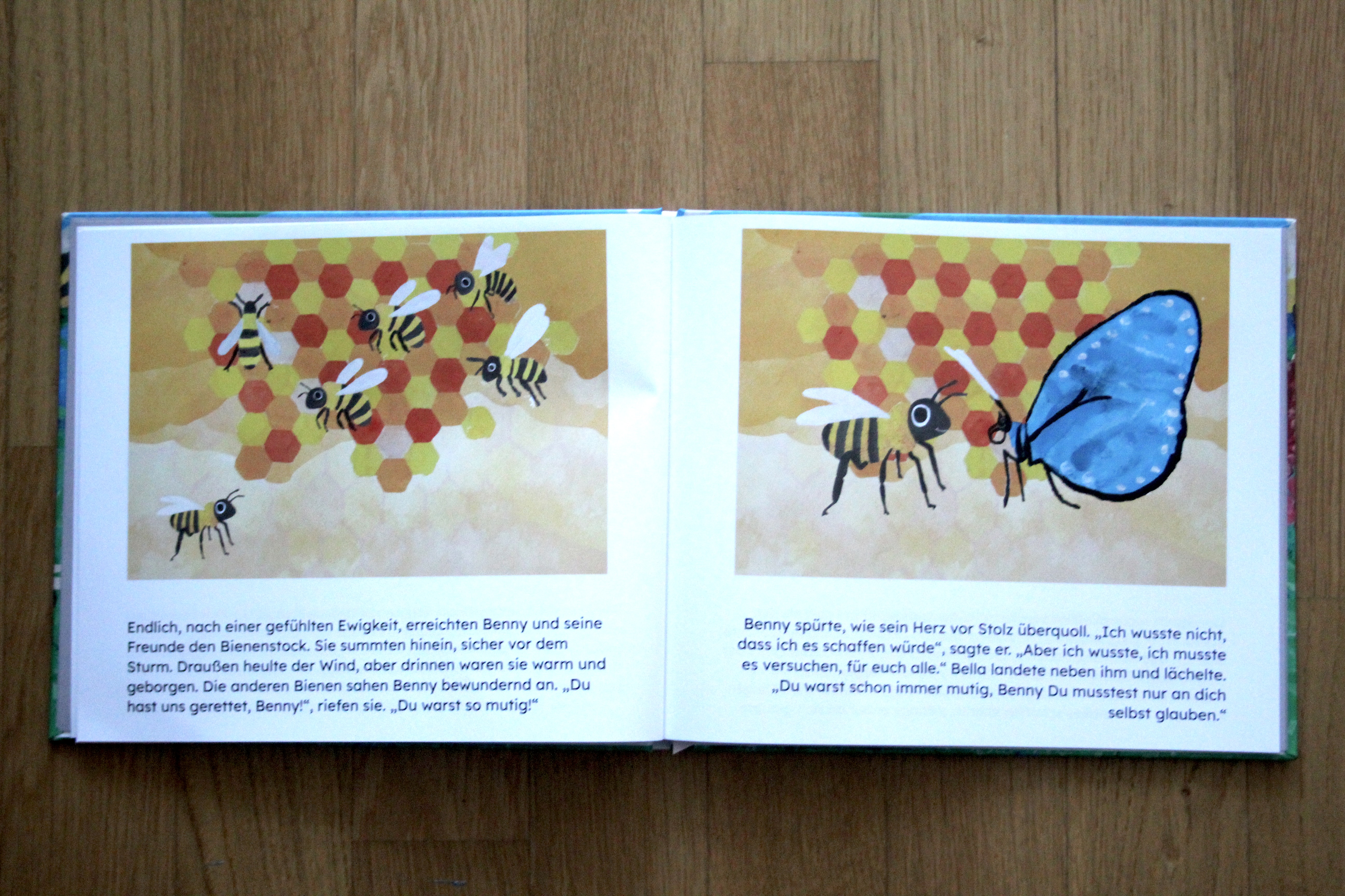 Es war einmal, auf einer sonnigen Blumenwiese, da lebte eine kleine Biene namens Benny. Benny war kleiner als die anderen Bienen und hatte im Gegensatz zu ihnen Angst vor dem Fliegen. Er beobachtete seine Freunde, wie sie umherflitzten und Nektar sammelten, während er nervös auf einem Blatt saß und hoffte, sich verstecken zu können. Doch eines Tages fasst er Mut und besiegt seine Angst. Damit wird er zum Held der gesamten Blumenwiese.